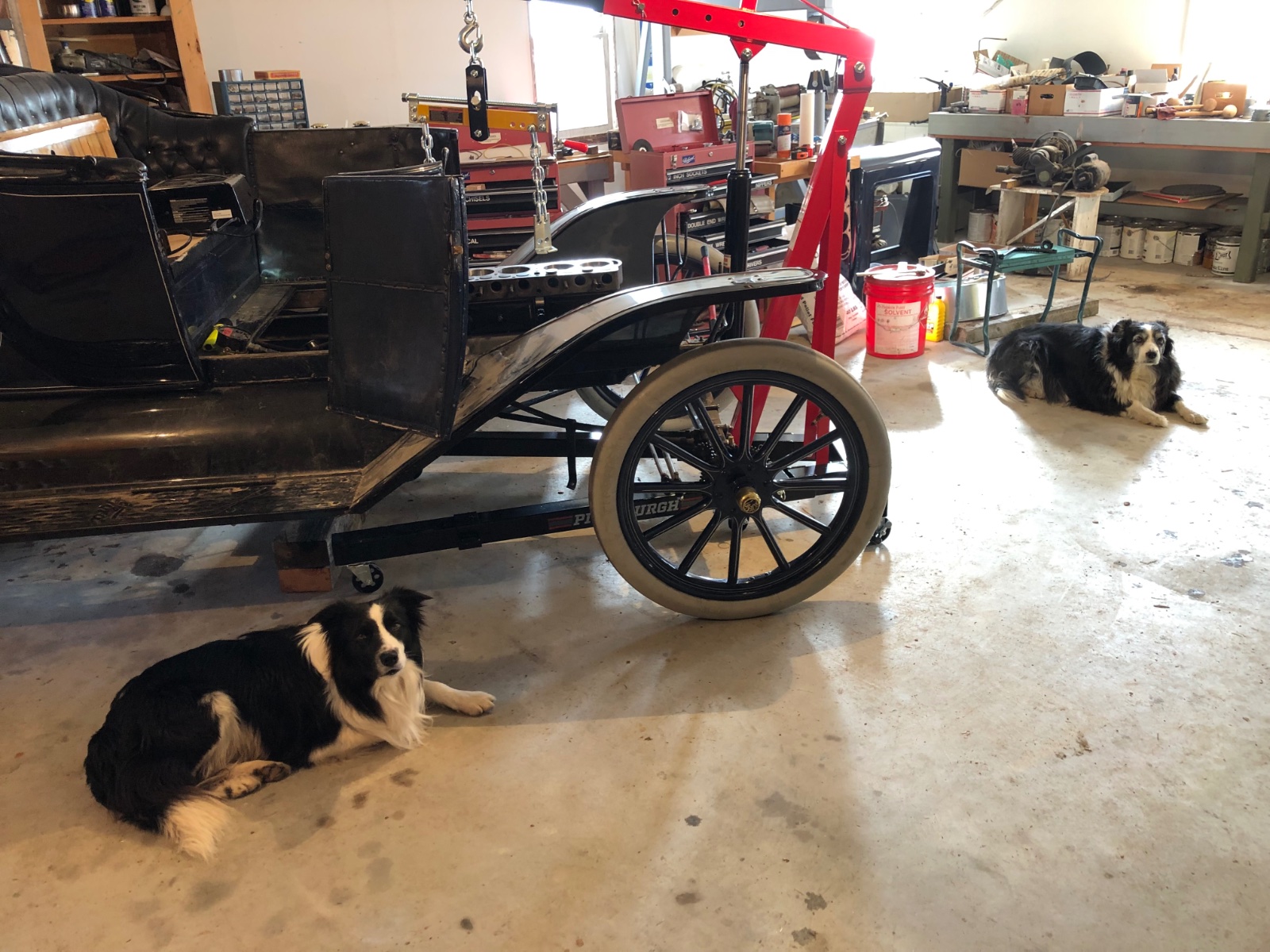 Good helper, right under the old Model T! Hopefully he will have a life-long interest sparked by helping you.