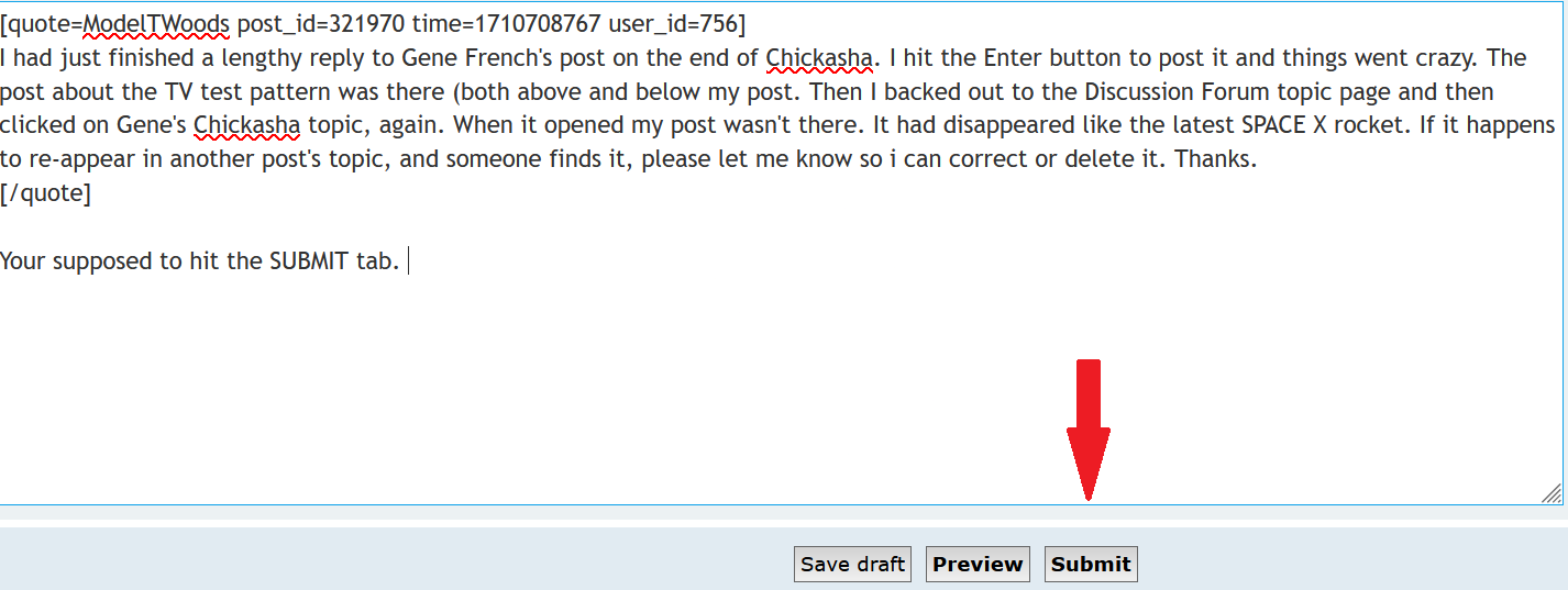 Your supposed to hit the SUBMIT tab. Not the ENTER buttonModelTWoods wrote: ↑Sun Mar 17, 2024 4:52 pmI had just finished a lengthy reply to Gene French's post on the end of Chickasha. I hit the Enter button to post it and things went crazy. The post about the TV test pattern was there (both above and below my post. Then I backed out to the Discussion Forum topic page and then clicked on Gene's Chickasha topic, again. When it opened my post wasn't there. It had disappeared like the latest SPACE X rocket. If it happens to re-appear in another post's topic, and someone finds it, please let me know so i can correct or delete it. Thanks.