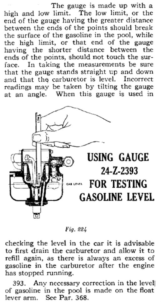 Here is the service bulletin page describing how to check the fuel level in the Holley G carburetor. Somewhere I have seen measurements for the gauge. If that was in a service bulletin I missed it. Where did I see that?