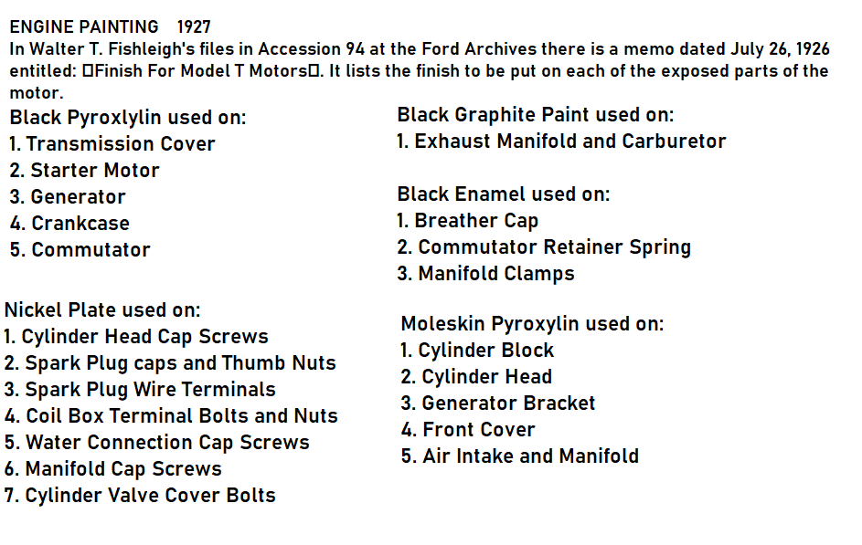 Ford pryxolyn paint did not last. There are no known surviving paint samples, chips, or paint codes. All paint codes widely accepted as the official color are somebody's best guess. If you think you have an original surviving patch of paint, take that part to a paint store or try to match with paint chips, otherwise, find a color you like and use that and call it whatever you want because nobody can prove you wrong. Decades ago, Les Henry, the head of the Henry Ford Museum, wrote a book on Model T restoration. It has been THE handbook and was considered an infallible reference. Les guessed at the colors, "matched" them up with Dizzler model A paint codes, and published what became the official color. In the 1970's, a time most people claimed all Model T's were painted black, I, and a handful of young purist authenticity or nothing restorers, painted my 1926 coupe Les's model A kewanee green as "deep channel green". Disliked the color then, absolutely hate it now that I know Les was guessing.