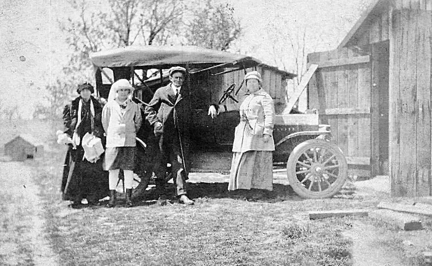 Note the lower part of the slant windshield is hinged to pivot out like the 1920-1925 Canadian open cars. US and English cars did not have that feature if I recall correctly (please chime in if I have that wrong or you know that is correct). The car has the door protectors the Canadian open cars 1920-25 had. It appears to have the horn button on top of the steering wheel. You can see the rear top window is rounded and NOT straight as a rectangular window would be. It also had the loose lug wheels (some USA cars also had the Kelsey loose lug demountable rims and two other styles of loose lug wheels depending on the manufacturer).