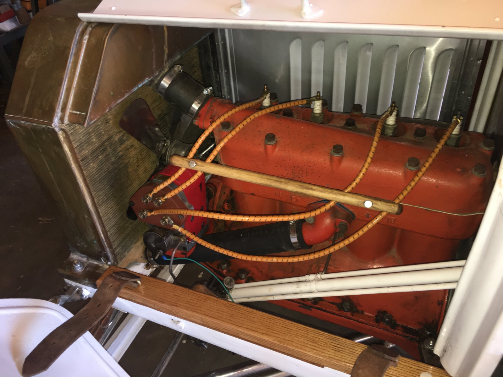 Easy enough, Bill even agreed to help prep the car for it's first drive. So off we went to my house and we added fuel. Wow, cool new waterfall... er: "fuel fall" as the NH overflows. Experimenting eventually led to replacing the brass float. A quick adjustment and tighten spark wires on the DU4 mag and we are ready to give it a try. Second dumb thing: The right rear tire is a little low, but since my compressor has just blown a hose, I can drive ok on a low tire.