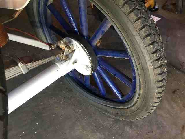 So next we pulled the chock and jumped aboard ready for the first drive. Clutch pedal half way down and throw brake lever all the way forward. Step down on the low pedal (easy on first trial not stomping on it as I usually do on my '27 pickup, "Rusty") and we are rolling, bump-bump out of the barn. Good so far so we roll out to the end of the driveway. Check foot brake, light but ok, and out onto our dirt road. 1/8 mile run in high gear then low pedal up steep part to county road. Turn around... well try to turn around but no brake and the reverse hits the steering column before grabbing... a pedal bend, reverse and brake adjustments are needed.