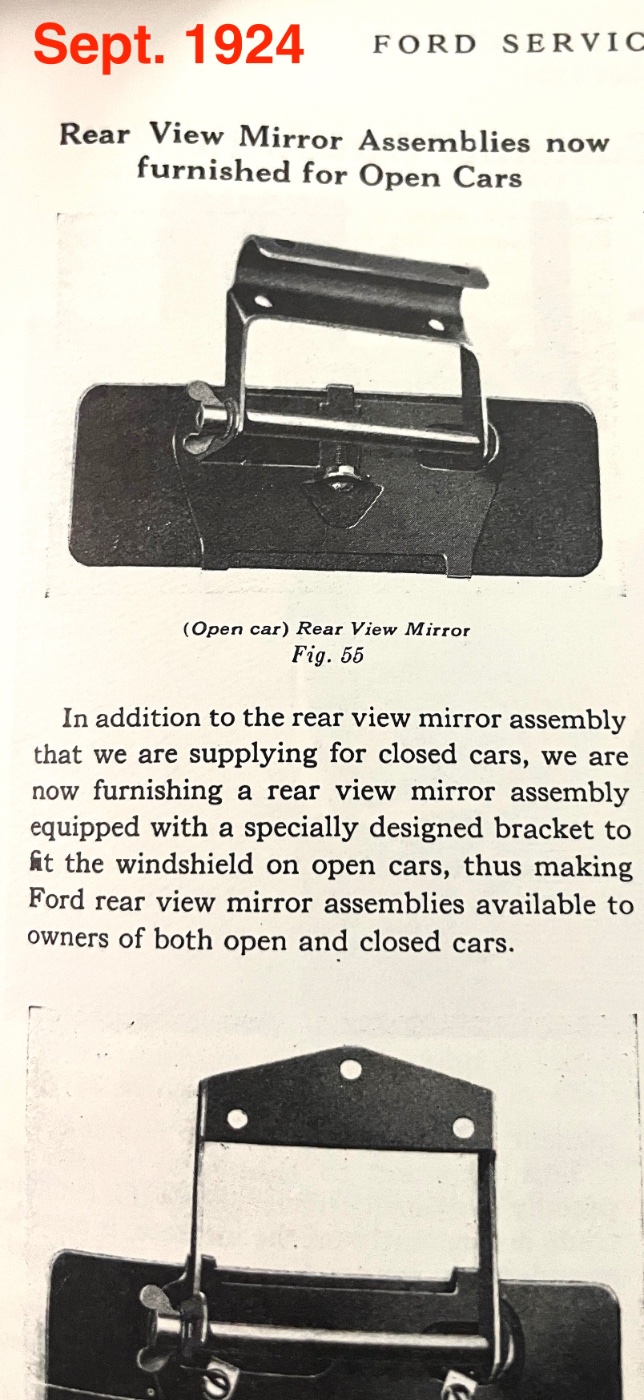 These accessories were available in June 1924, and late '24 open cars have the 3 holes drilled in the upper frame. So by 1925 the mirror and wiper could be added. Believe that the more costly closed cars got the wiper and the closed car style mirror as factory standard by 1925.