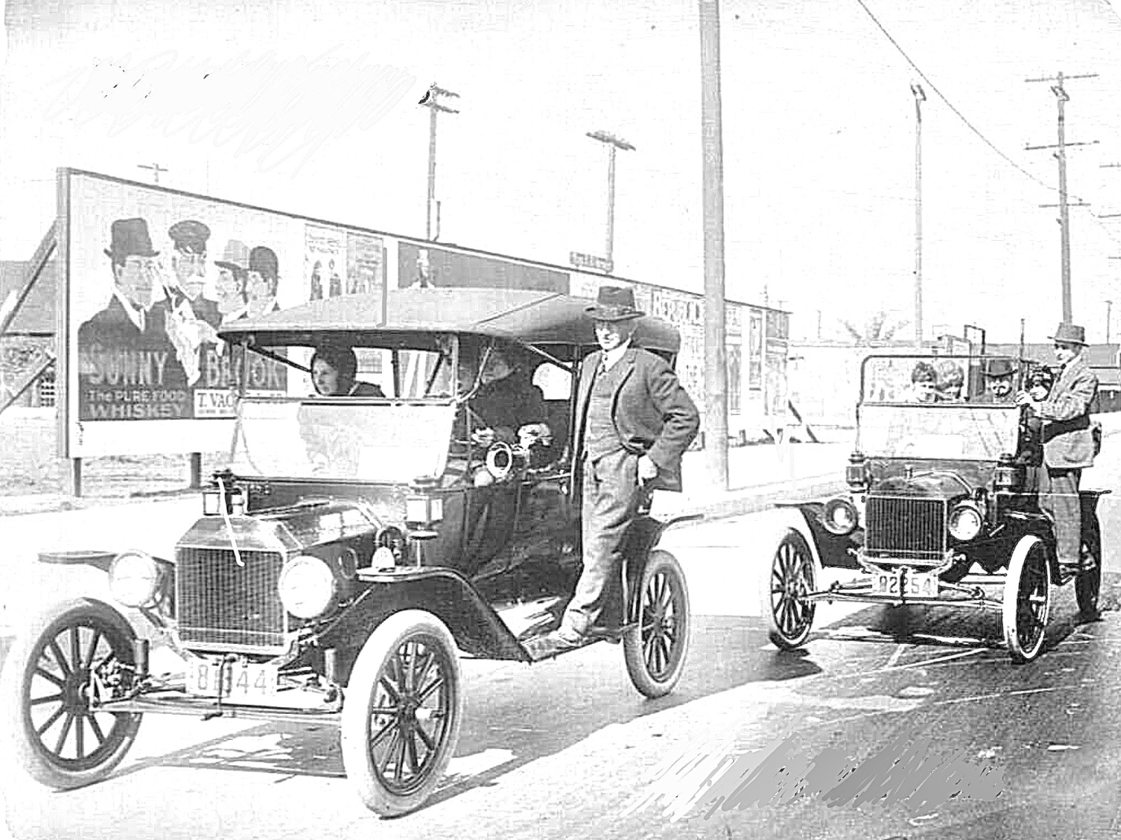 The second picture is probably of "jitney riders", a jitney being a private car for hire. These were popular in Los Angeles as it rapidly grew outward. Regulation put a stop to the practice.