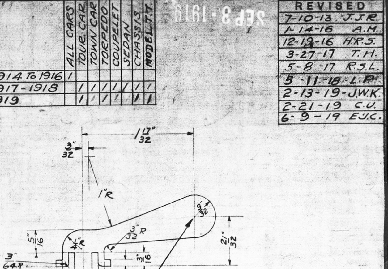 .......On May 8, 1917, the key was redesigned. Instead of an assembly of three pieces, the key was made from a single flat piece of cold-rolled steel. The name of the key was changed as well. Instead of “Switch Lever Assembly,” this part became known as simply the “Switch Key” This design was modified slightky on June 19, 1919 by changing the inside corners of the “L” shaped plugs to have a 3/64” radius instead of a square corner to strengthen the dies which made the key.