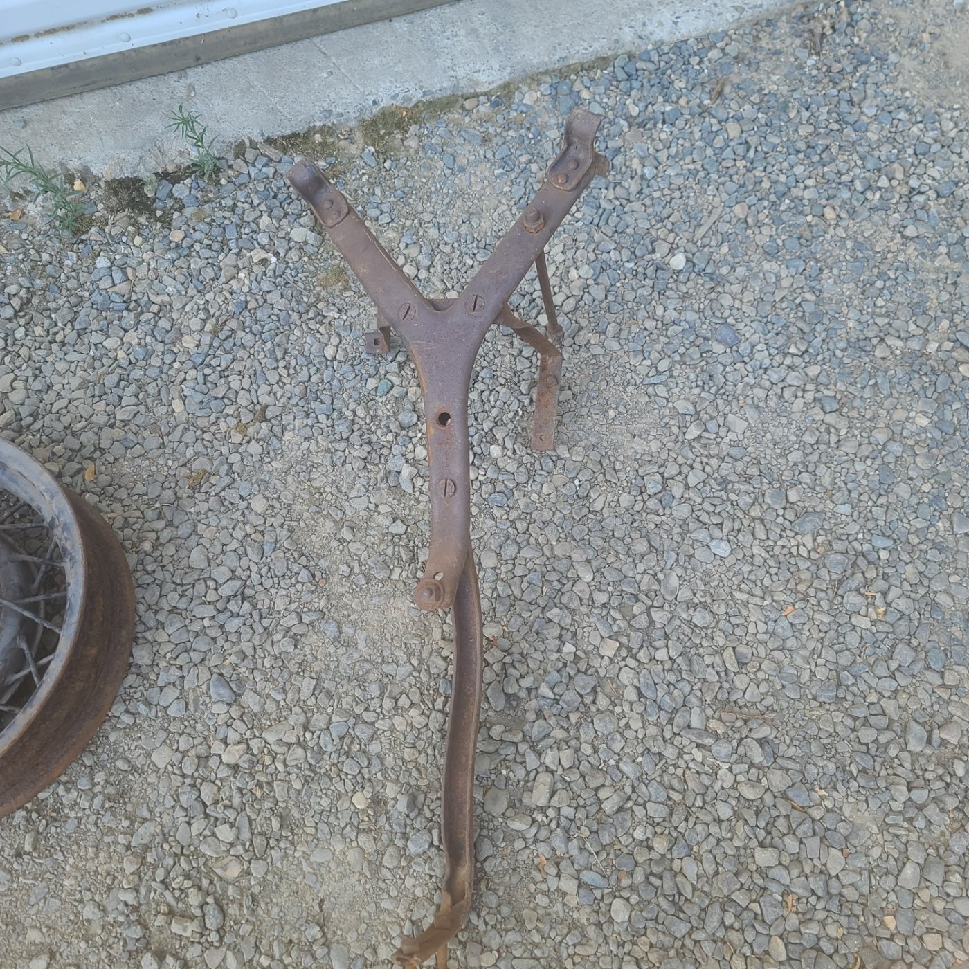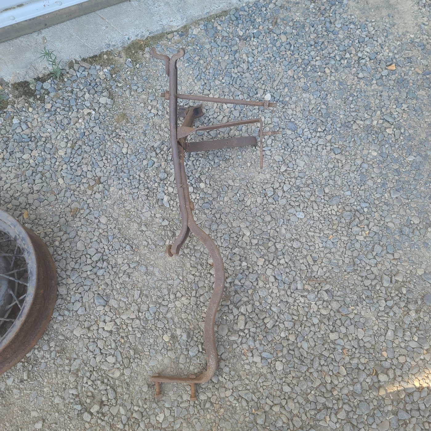 Modified ‘25 style for split rim by someone for a truck or hack. The lower leg to the running board, for side mount.