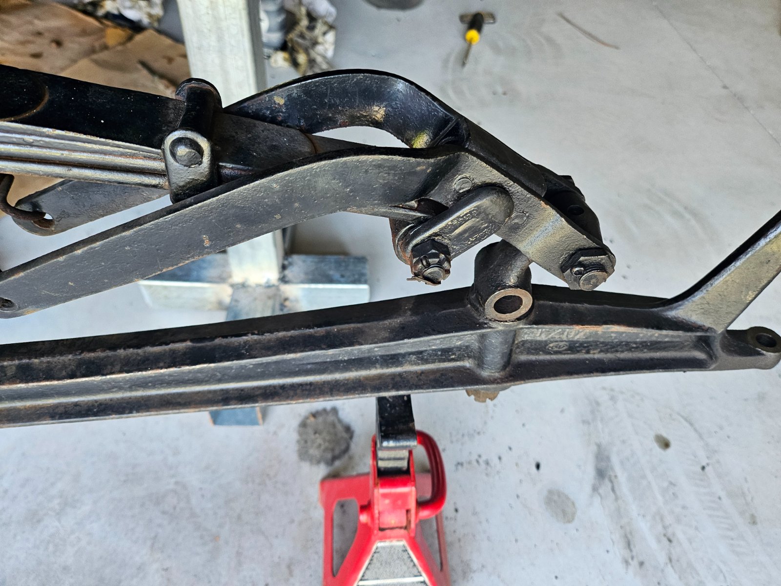 The frame cross member appears to be in good shape. No obvious bends, rivets tight, no cracks, no major corrosion, and the spring bolt receiver is still square, not worn/cracked/wallered out.