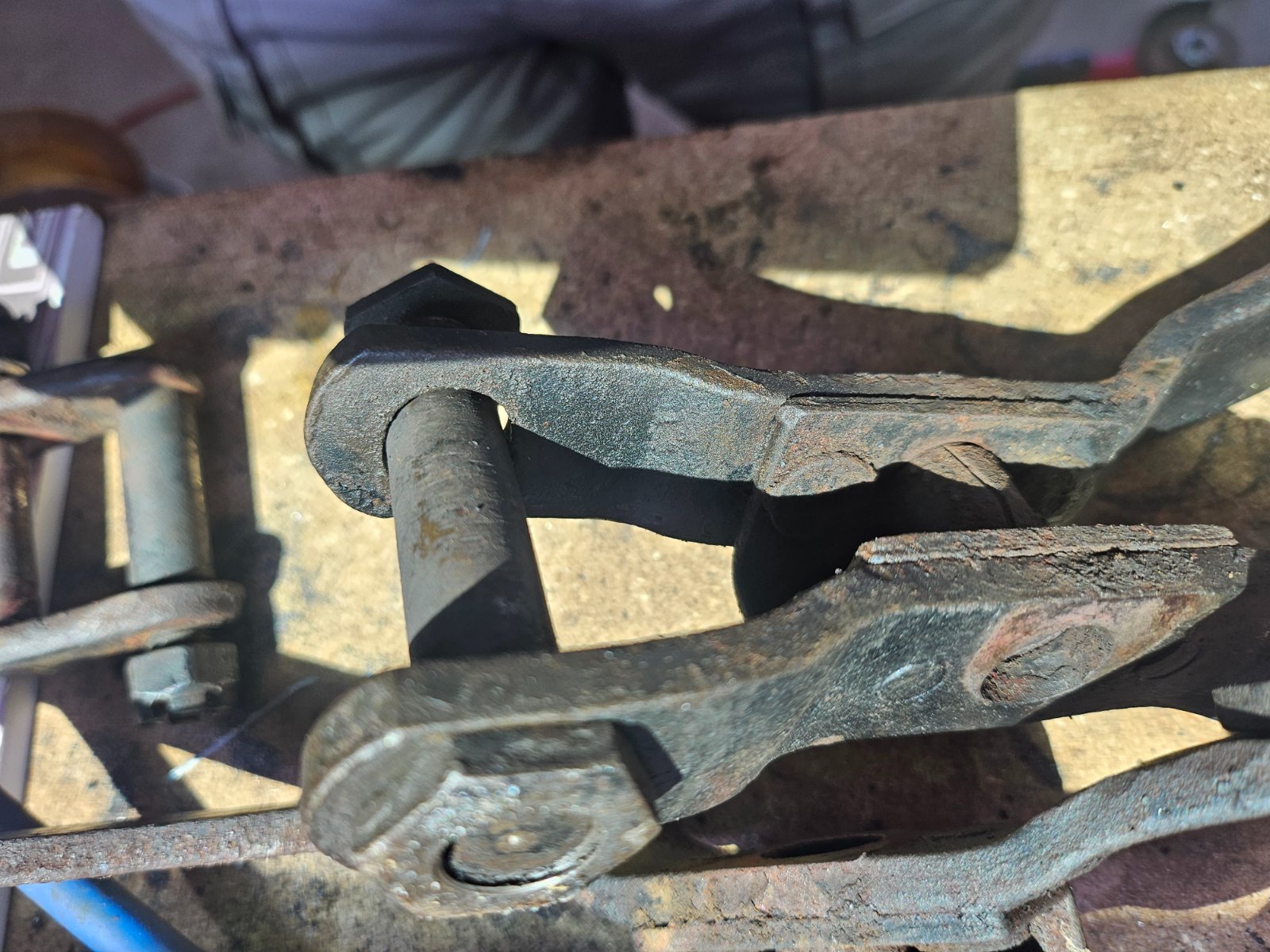 I haven't touched the rear axle yet, but removing/rebuilding the rear shocks will require getting some stock rear perches...the shock system replaced the rear perches, while using/reversing the fronts. In the pic you can see the flat perch style. This part also has some cast markings, only part of the shocks with any kind of marking... still can't make them out though. But, while not yet investigated, one side is disconcerting, reviewing the pics I take of everything, I don't know yet if it's a scratch, casting indent, or a really bad crack seen left of the bolt head.