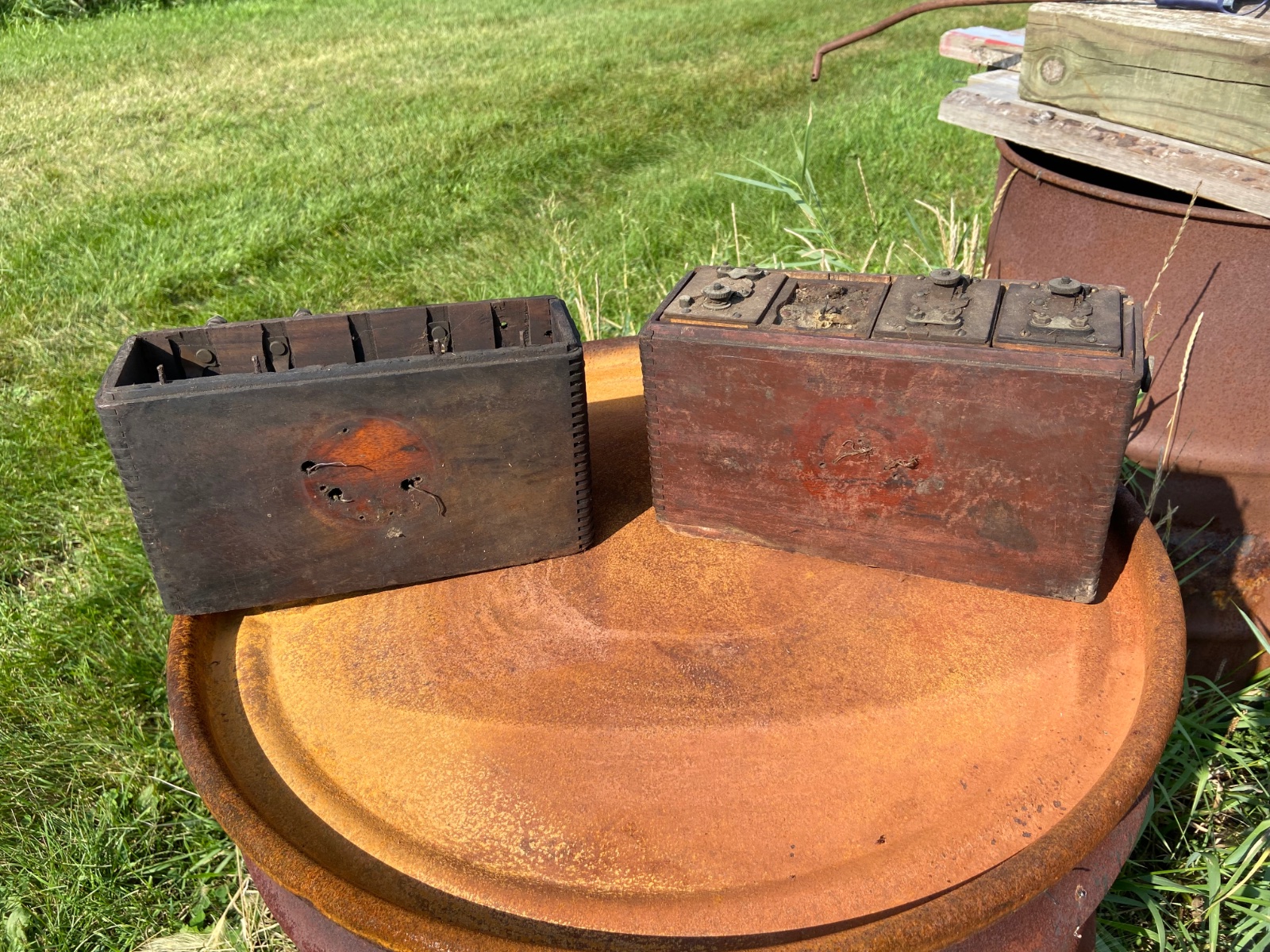 The box on the right is a 1912 Heinze box with the coils arranged in mismatched fashion. The earlier Heinze coils in 1911 used a separate post to "ground" the top, and had combinations of more screws to hold the tops down. The Heinze company must have been a favorite of whoever was selling blueprint supplies to them, because the designs changed constantly.