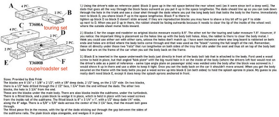 This little article seems to direct the tiniest block to somewhere near the front body mount. Interesting that the tiny blocks are anchor points for the splash aprons so that should locate the little blocks.