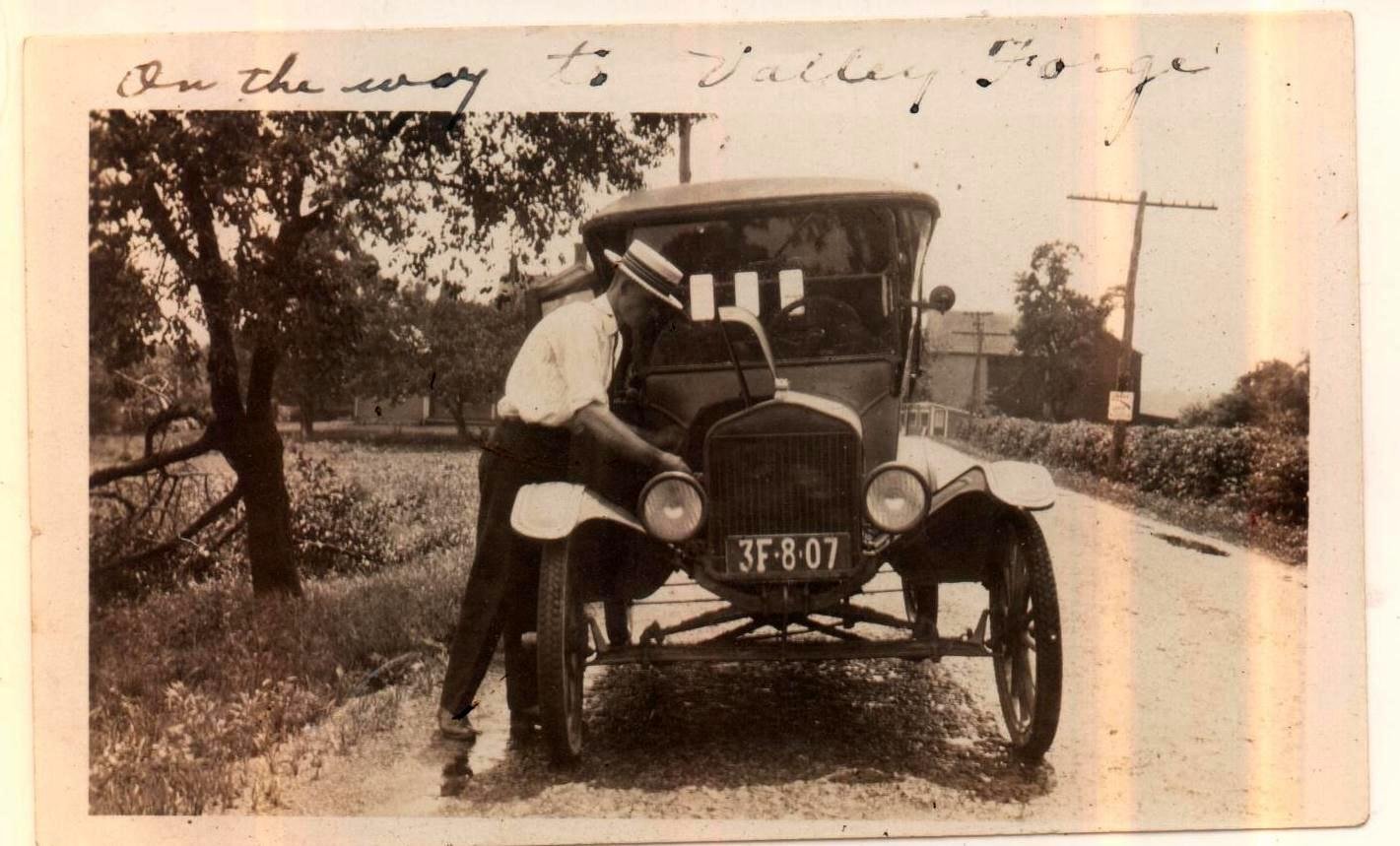 I was puzzled by the license plate as the state seems to be behind the lower radiator trim. That numbering system and letter style appears to be a 1926 New York. That would make it an older car for this photo. Is he adjusting the carburetor or checking dinner on the manifold? Also he is standing in a puddle. It must have been a great trip and the hat is very fine.
