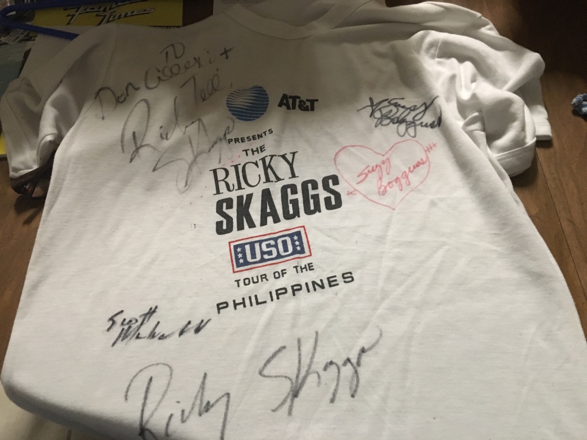She and Ricky Skaggs came to Clark Air Base in 1989 to do a USO tour. I was working the US Customs desk with my drug dog when their plane landed at 2am. They were ushered into a VIP room while their paperwork was processed and, being a huge Skaggs fan, I snuck into the room. They were both so very gracious and kind to that desperately homesick 20 year old kid and she was a pretty as a picture and seemed like a living angel to me. They both signed a tour shirt for me that I’ve kept all these years.