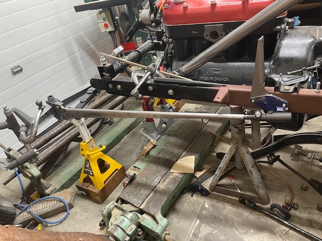 I have abandoned the stock front end wishbone for my 26 speedster and gone with radius arms between the lowering brackets and the frame (see the attached photos for some shots of work in progress). I have a ball joint at the frame but the connection to the drop brackets is solid. This is consistent with what I see in the period speed books (Secrets of speed and the fast ford handbook) but I am wondering about the forces generated by this type of rigidity. In modern cars, they use Heim joints to allow everything to move freely, but that is not period. Am I over thinking this?