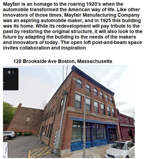 W. S. Carruthers, M. K. Coates and Frank L. Hamilton founded the company in 1925. Jesse J. Billington was also involved. Its seat was in Boston, Massachusetts, and the factory in the Jamaica Plain district of Boston. They started producing automobiles. The brand name was Mayfair. Plans amounted to 3000 vehicles per year. In the same year, production ended. A total of about ten vehicles were built