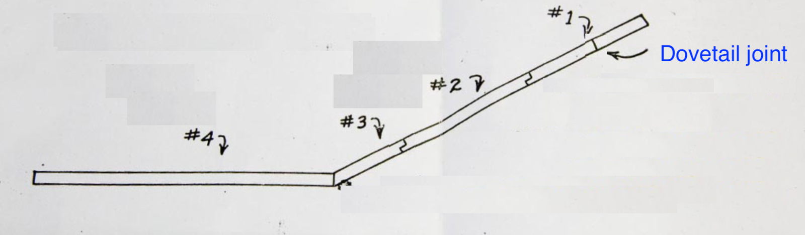After some inspection I was surprised to find that the upper board (nº 1) is made from not 1 piece but 5 pieces of wood which are dovetailed and the riveted metal pedal slots hold them together. This shows the 4 pieces which are dovetailed to the upper piece.