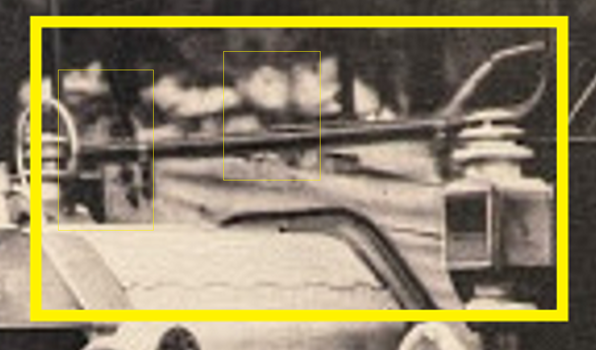 Might it be an AI image? Look at the yellow rectangle. The image on the firewall is part of the image through the front window. Then too the shadows on the fender edges don't match & the position of shadow under the car doesn't agree with the top of the running board and I would expect more shadow under the car towards the woman .