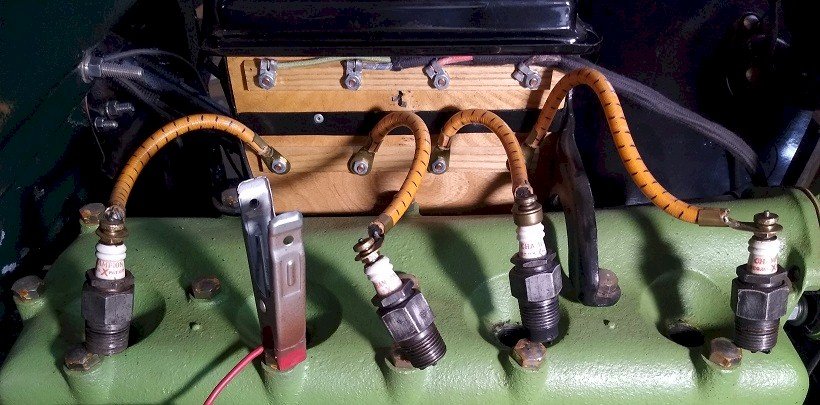 The engine is not running and I suspect it’s both a fuel and spark issue, maybe valves. I hear about three to eight hits and then it dies. Sometimes it runs on three cylinders. The choke rod to the dash was dragging against the hot pipe to the carburetor but I fixed that. Two weeks ago the carb poured out gasoline when I switched the flow from the sediment bowl to “ON” but now that problem rectified itself most likely from fresh fuel cleaning away any varnish. Having done the above, I resumed with electrical diagnostics. There are four new coils and all new wiring harnesses.