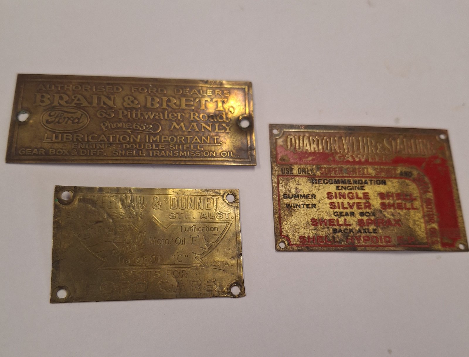 I have a small collection of brass plaques from different car dealers. These all promote the use of Shell lubricants. My guess is Shell sponsored their production. Others are Mobiloil sponsored.