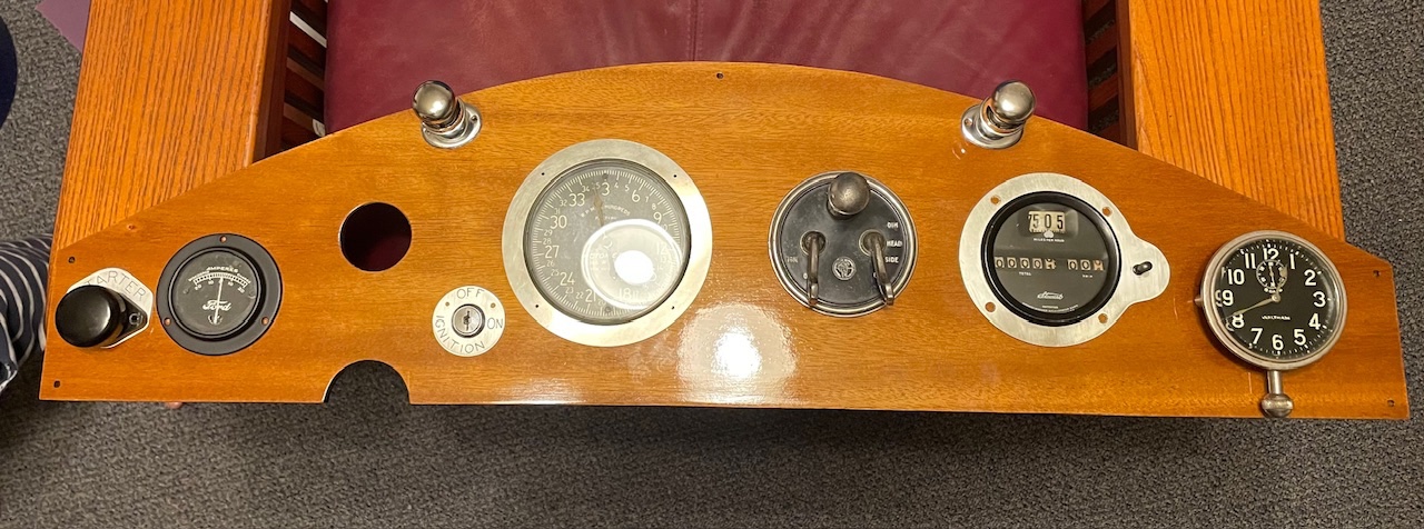 I started the dash a while back and it’s been a fun project for when I don’t have time or energy for working on big things. It has a Waltham 8 day car clock, a Stewart speedo, an American Bosh ignition, a vintage Victometer (Jos. W. jones) tach that reads to 3,500 RPM, an on/off ignition switch, an original Ford Ammeter, a period automotive momentary switch, and a couple of dash lights. The open hole is for a water temp gauge. I have one that works, but I am looking for a period one that fits. I still need to do some fitting and wiring on the back side, but it’s looking pretty good. The sad part is that the dash will need to be packed up until the rest of the car is ready. Sorry about the reflections, it’s hard to photograph.