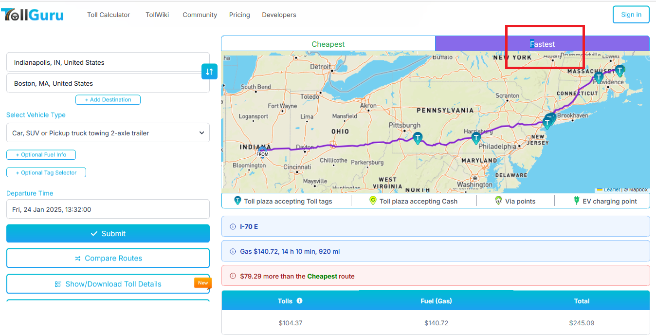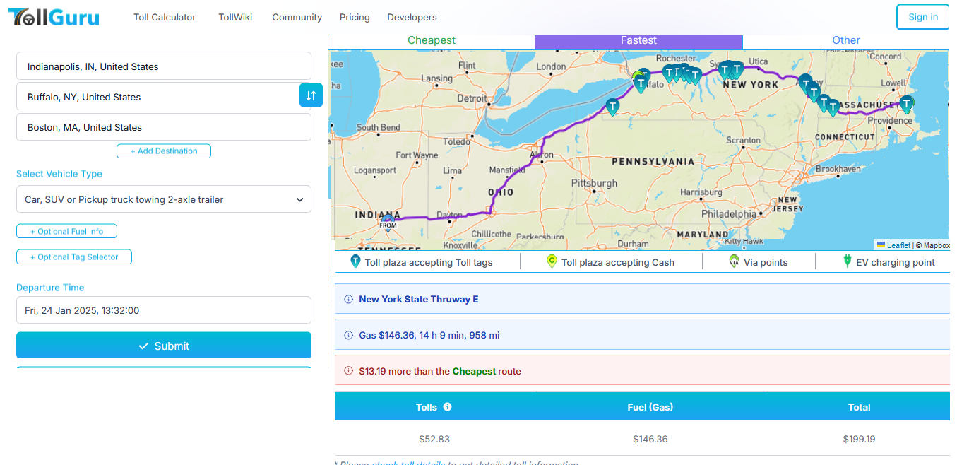 USE THIS to Calculate tolls for any route https://tollguru.com/toll-calculator