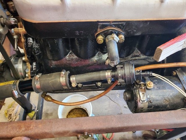 A friend of mine has a T-Go over head & it will not thermosyphon enough to cool the engine with a new Brassworks radiator & the exhaust is in the way of 90% of T water pumps so we went