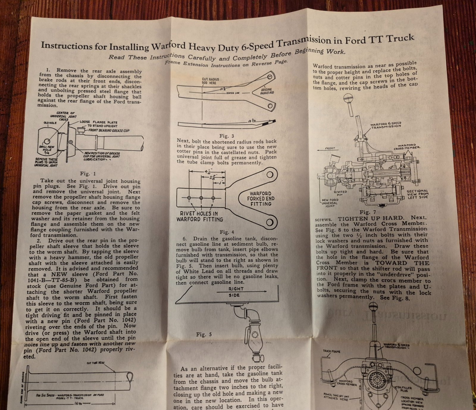 I found the original installation and operating instructions for the Warford Heavy Duty (cast Iron case) 6 speed (reduction, normal, overdrive) transmission. It was in a box of stuff I gave to the new owner of my TT. Paid him a visit this weekend, and was able to retrieve this and some other goodies. The instructions (and tranny) were specific for the TT, so measurements would have to be extrapolated for installation in a car.