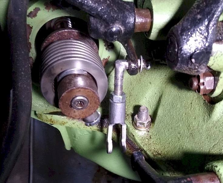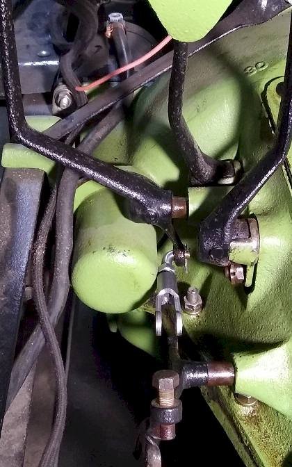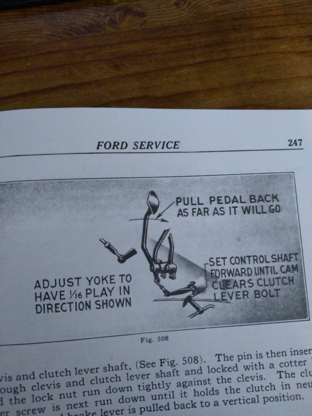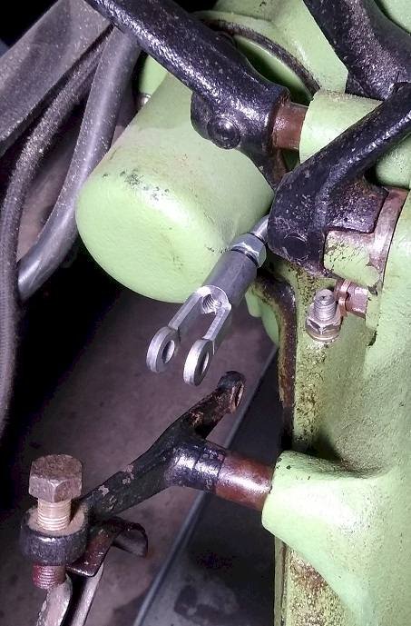 After turning "the slow-speed adjusting screw, so that the slow-speed band will be fully engaged a couple inches before the pedal reaches the floor boards", I connected the "slow speed connection rod". The cotter pin barely fit in and the linkage was binding against the Bendix cover, while the clevis did not line up with the "clutch control shaft". Basically, I can hardly install the parts, let alone ensure movement.