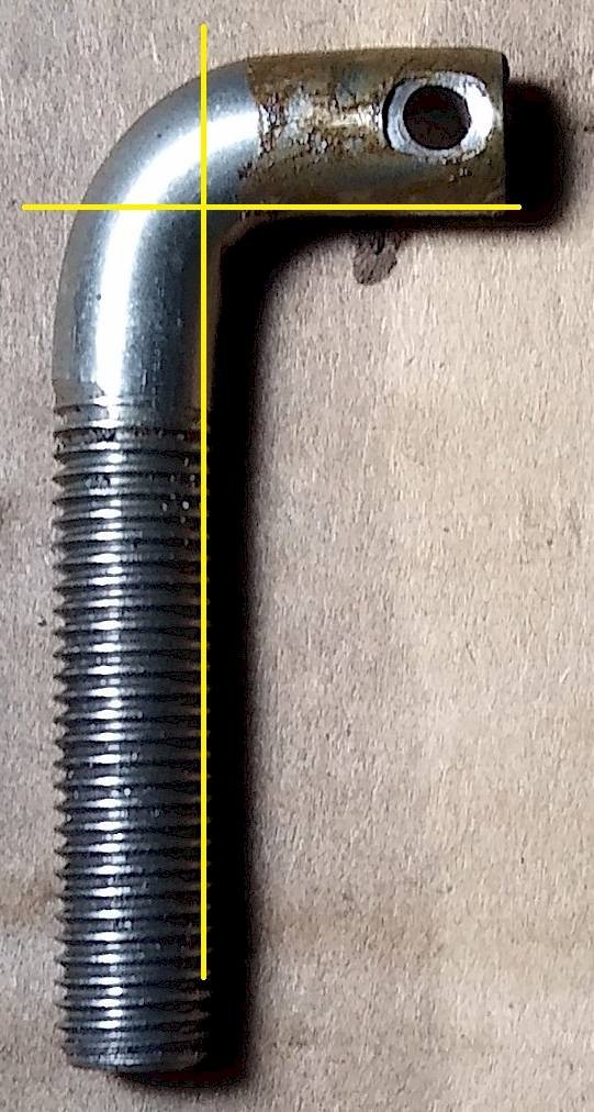 Then the bolt was measured and marked at 3-1/8" for the center of two 45º cuts. I should have subtracted half of 5/16" from that. I then torched and bent the bolt for a sharp 90º, cut a wedge and welded the angle in place. After grinding, I cut the hex head, and drilled the cotter pin hole.