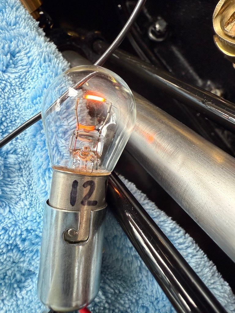 The bulb does not light @ idle, yet the motor still runs very well on mag. @ road speeds It glows bright. I had to use both filaments or the light would burn out.