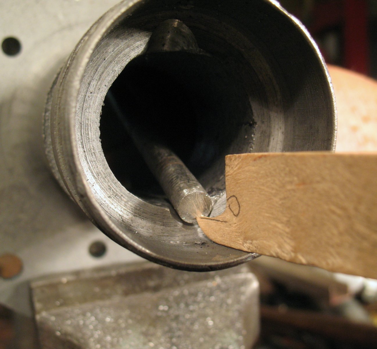 Checking notch depth. The stick shows that a drift pin will be able to reach a roller bearing cup.