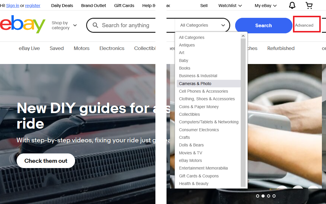 eBay Motors doesn't appear in the main drop down