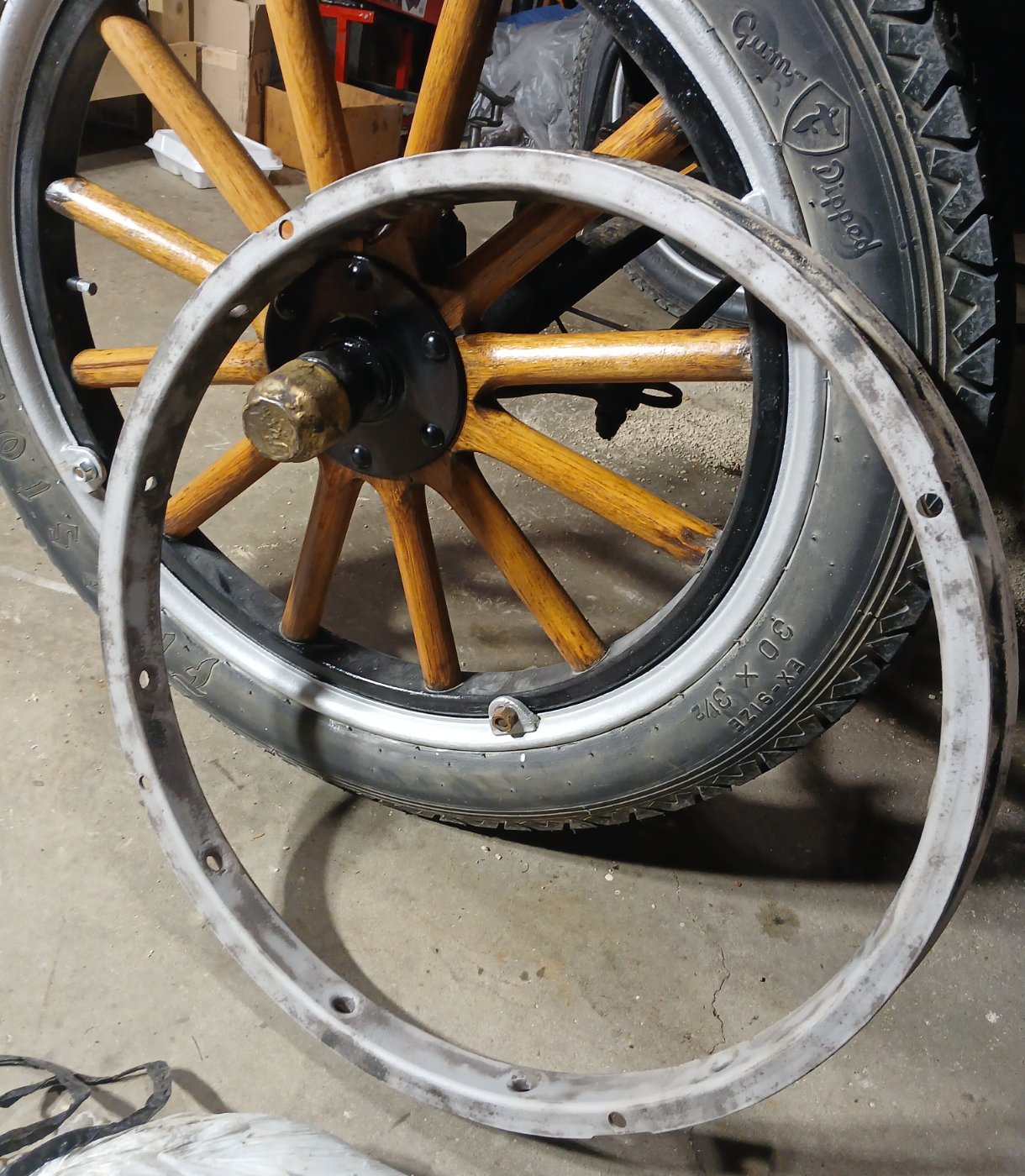 Interestingly, 21" Hayes wire wheels have an outer edge of the felloe rolled to the outside, making the relief for the lug foot even more interesting.