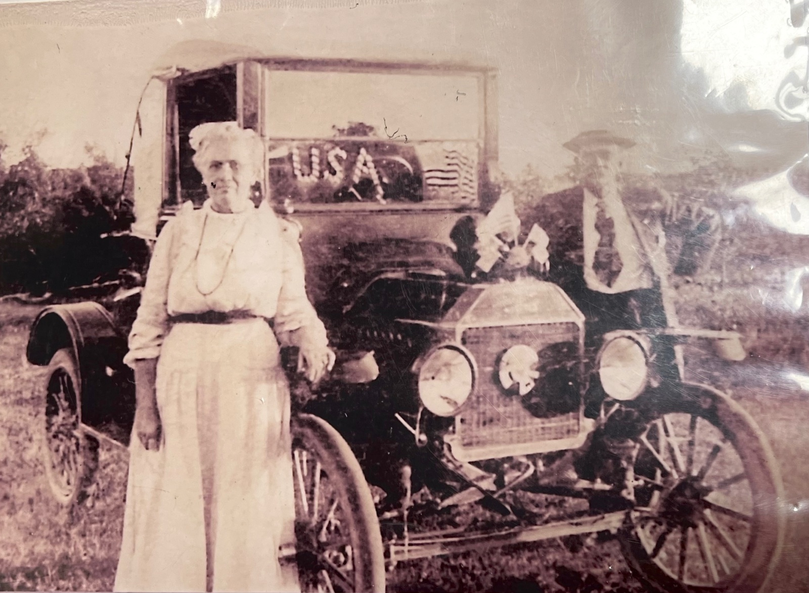 Here is a picture of the car, circa 1917. Look carefully and you’ll see the American flag in the windshield of the car, alongside the original owners.