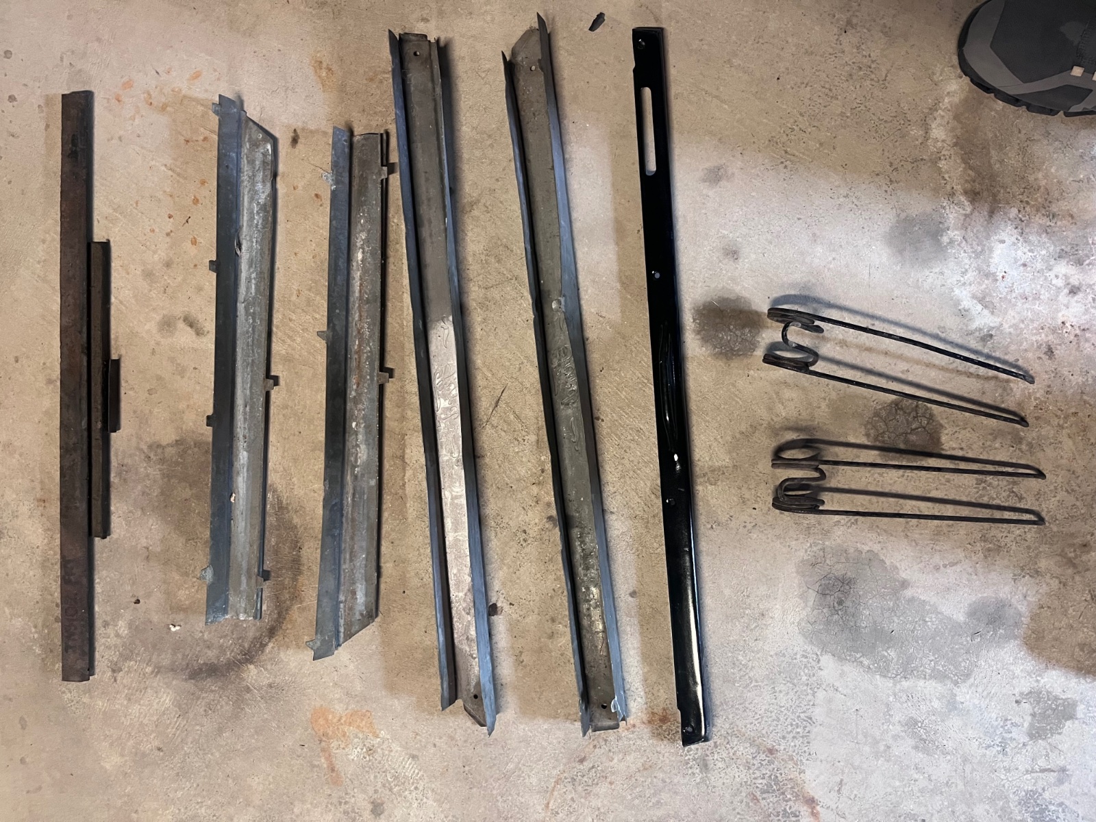 Speaking from the top and middle picture; the item on the far left is a glass channel for one of the doors. It is raised and lowered by a round part of the window regulator moving within that short channel on the bottom. The spring steel thingies on the right are aftermarket accessories meant to tighten up worn out tie rod bushings on a T whose owner won’t repair it correctly. Lastly, the item to the left of these accessories is door trim. See the slit at the upper end ? That’s where the door latch lever protrudes through when mounted.
