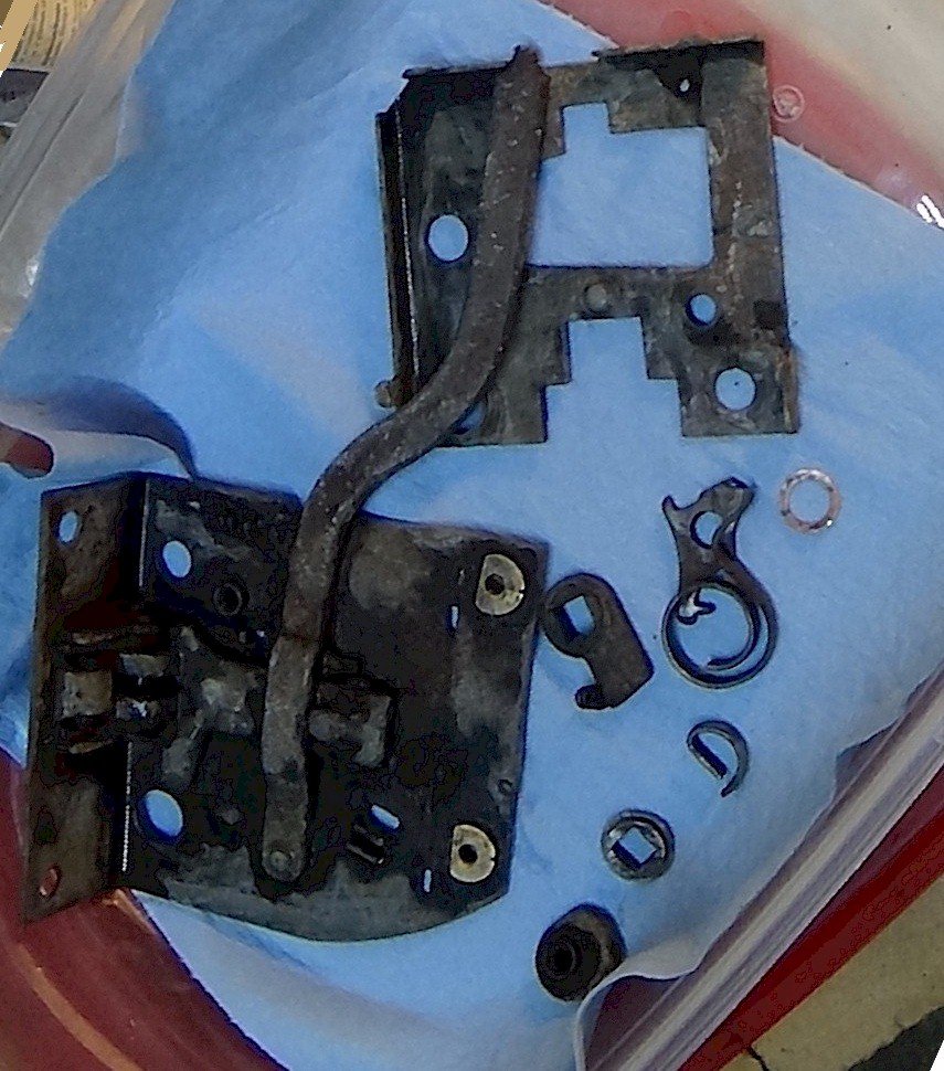 The internal replacement hardware from the vendors is installed but I have yet to flatten the rivet on the base of the lever. This is the left (drivers) side. The mechanism cover, with four tabs, is not installed.