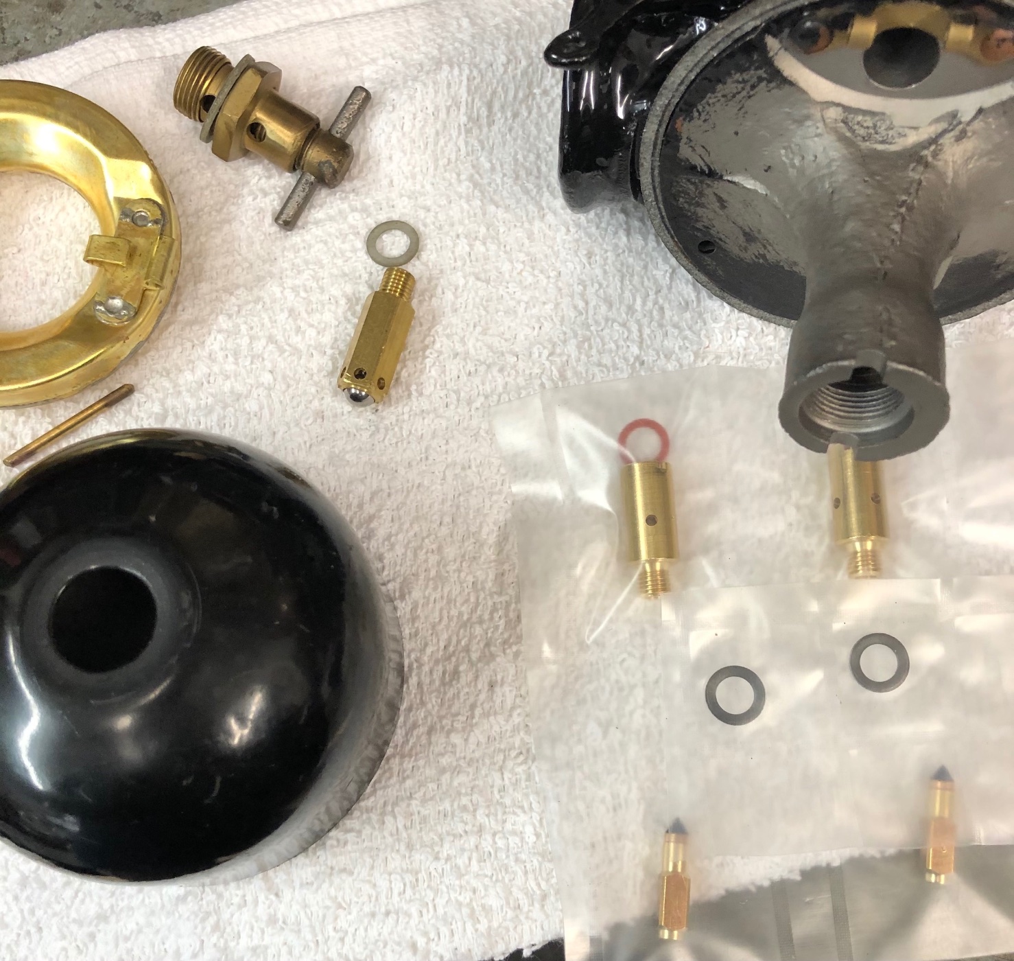 Gross Jet on far left, being replace with Scott's Full Flow seat which has correct size orifice and a regular needle valve.