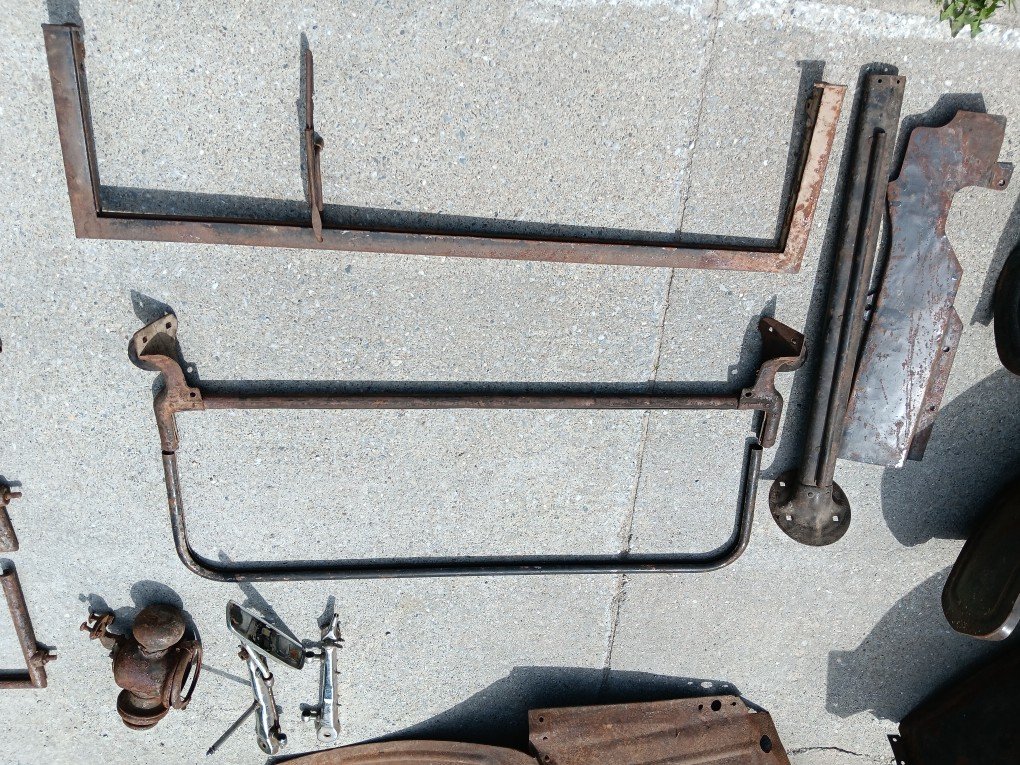 Here is some photos of a batch of parts that came from an old Ford dealership. Not sure of the year or model of most of them. One windshield frame had the remaining part of an inspection ticket as did one HL rim.