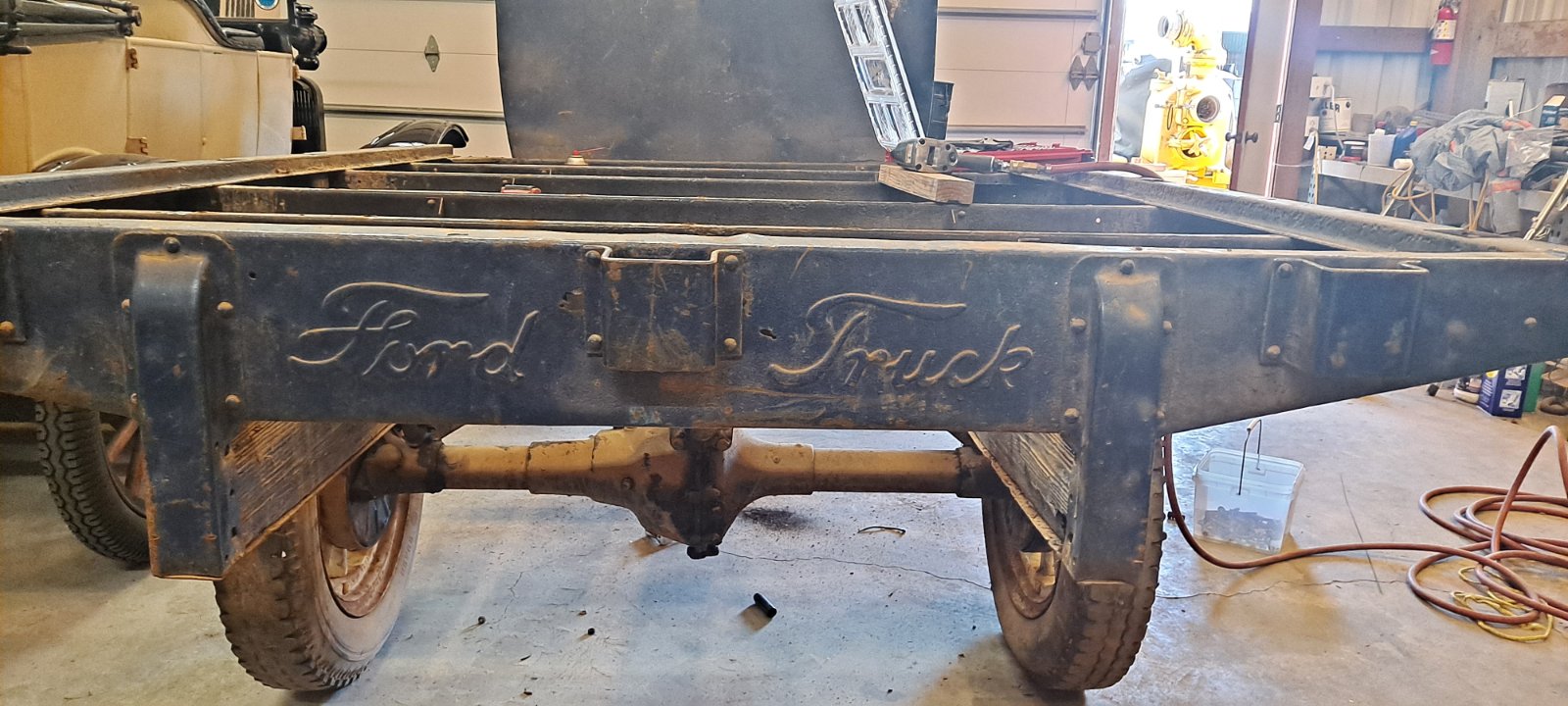 I totally agree it is a factory TT stake bed. I think that I am correct that all Ford factory stake beds used from the Model AA up through the early 1950's only had Ford in script on the rear crossmember. Later Ford factory stake beds in the 1960's had Ford stamped on the rear crossmember, but it was in block letters and not script.
