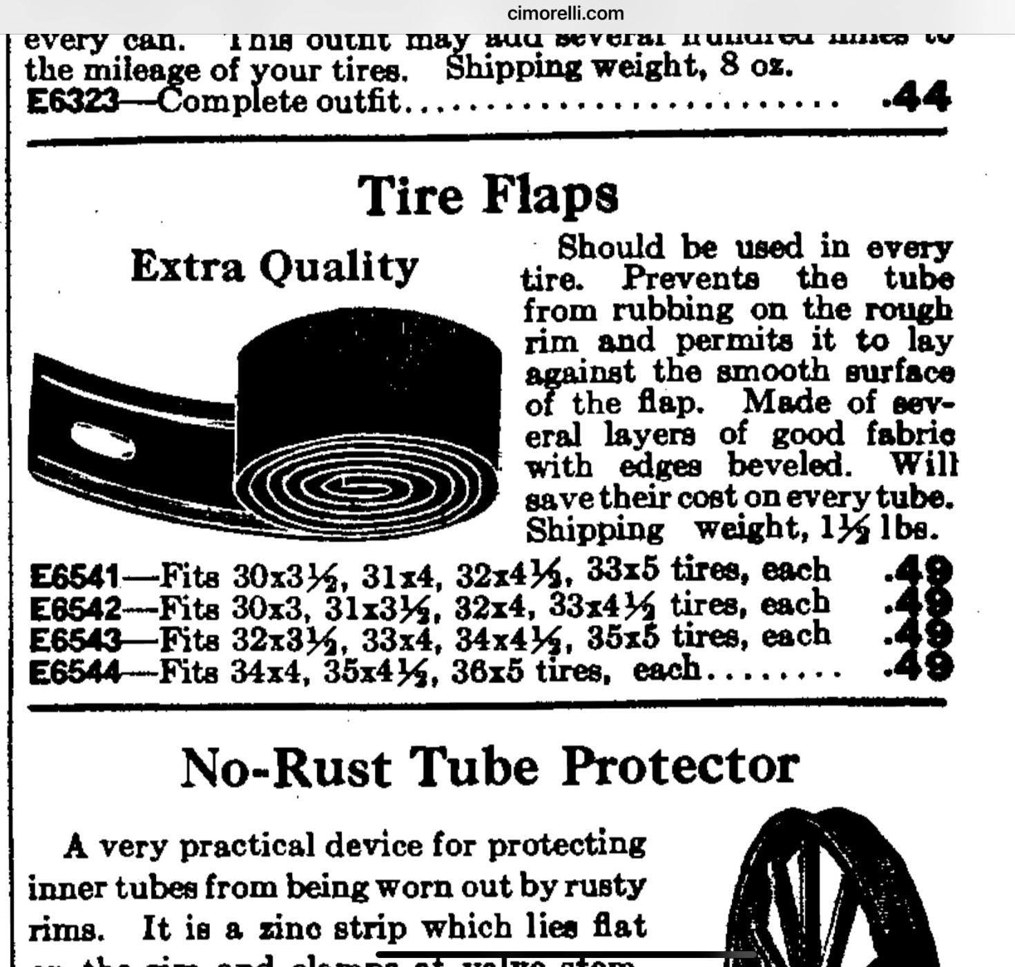 Aha! Quite right. Ford didn't bother with flaps for clincher tires. On new rims they would be a waste of time and money. I'll extend that 100 years and point out that if your rims are good enough, flaps are still a waste of time and money. I have driven thousands of flapless miles because I paid attention to the quality of the rims I used. Did I have any flats? You bet. But I attribute them to punctures, underinflation, and other problems that didn't include bad rims. When you send rims and other metal parts to the wheelwright for a new wheel, use the best rim you can find. If there are any rough spots, get rid of them.