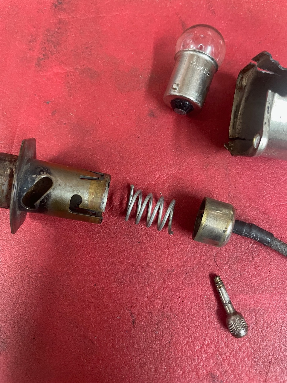 Going back together some sort of fasteners will be needed, as the spring behind the cup and bulb contact exerts some force. Maybe small Pop Rivets may work, have used them to mount the metal stop stencil and glass lens to Ford ‘26-‘27 accessory stop/tail lamp rim. Had to slightly overdrill the hole of the Pop Rivet to allow the retaining screw to pass.