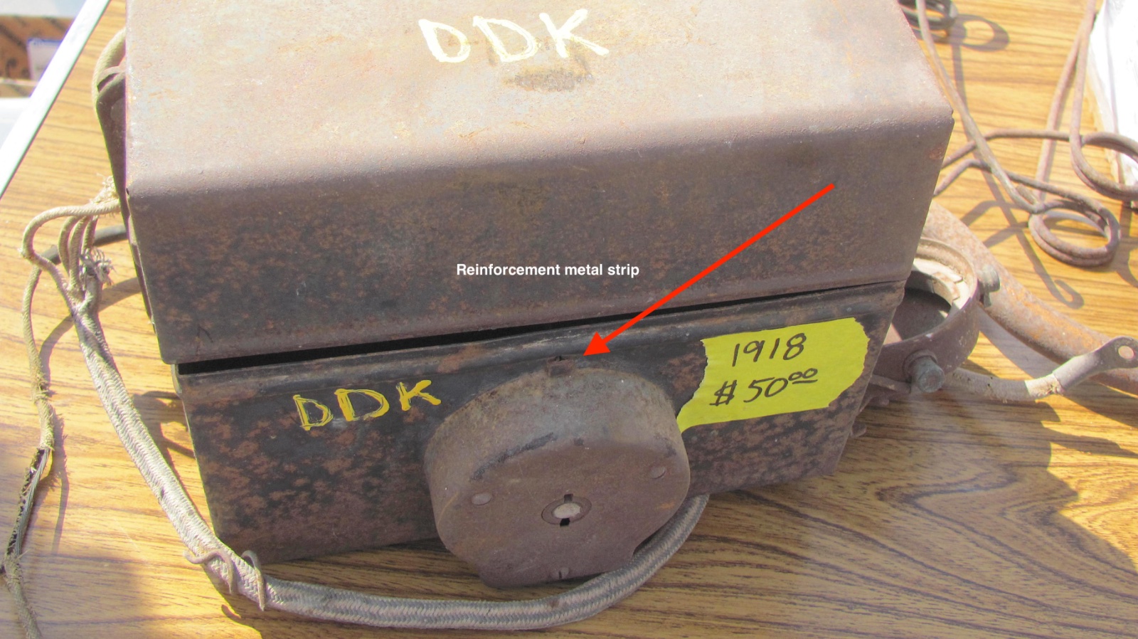 Here is a 1918 box with steel face switch and sure enough has the reinforcement strip from front to back wood. Was searching my old Chickasha photo files just ran across this one , oops :(