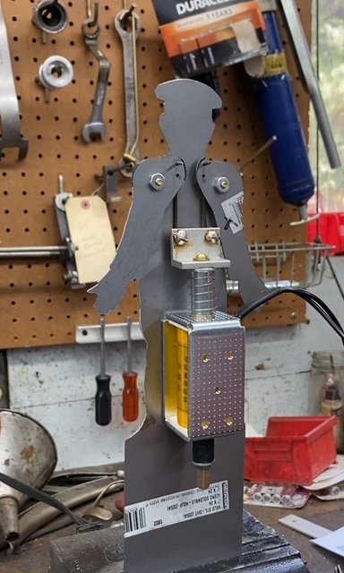 I since our 1922 coupe is now 12 volt, I used a 12v solenoid for electric door locks of a modern car, to active the arms. Once I got the arms mounted, and figured out the linkage from the solenoid to the arms, and then just for fun, I added to tiny LED lights installed in the cop's gloved hands, in place of the tiny "STOP" signs the original had. I also used a 12v 25 amp electronic flasher in the circuit to the cop, so he would continuously raise and lower his arms when in operation.