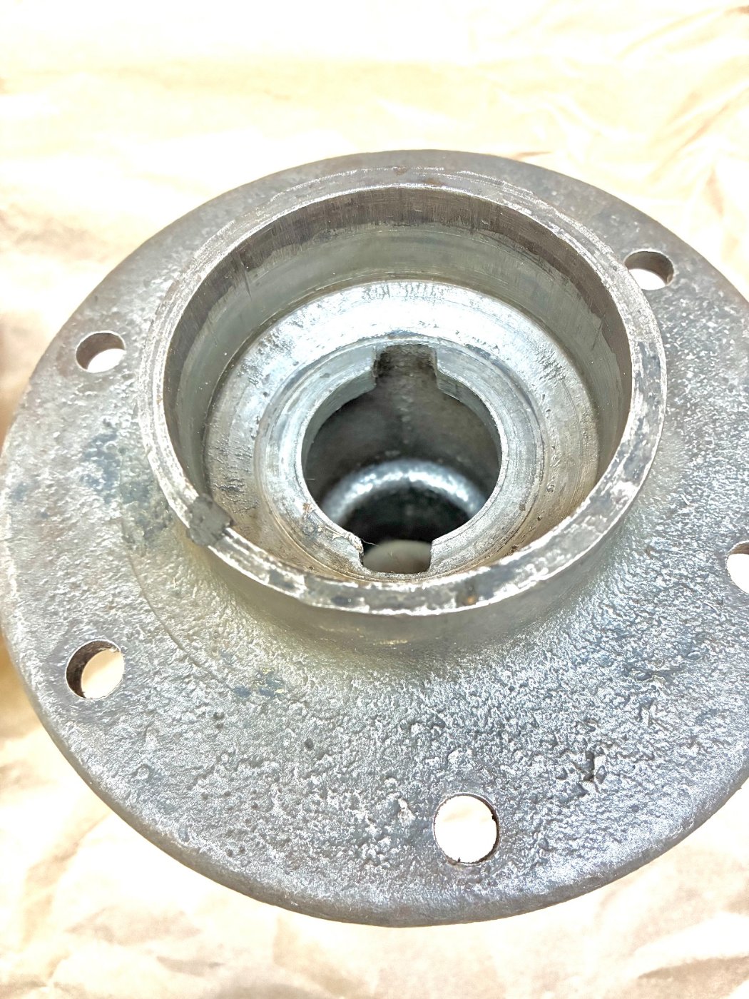 It appears the ability to easily punch out the large bearing cup was not initially part of the hub’s design. According to the archives, on 12/4/12 a change in the casting to remove what looks like a ¼” deep reinforcing collar just below the bearing cup was made. Then on 12/18/12, a reconsideration was made to reinstate the reinforcement, but with two cutout openings to still give access to the underside of the bearing cup.