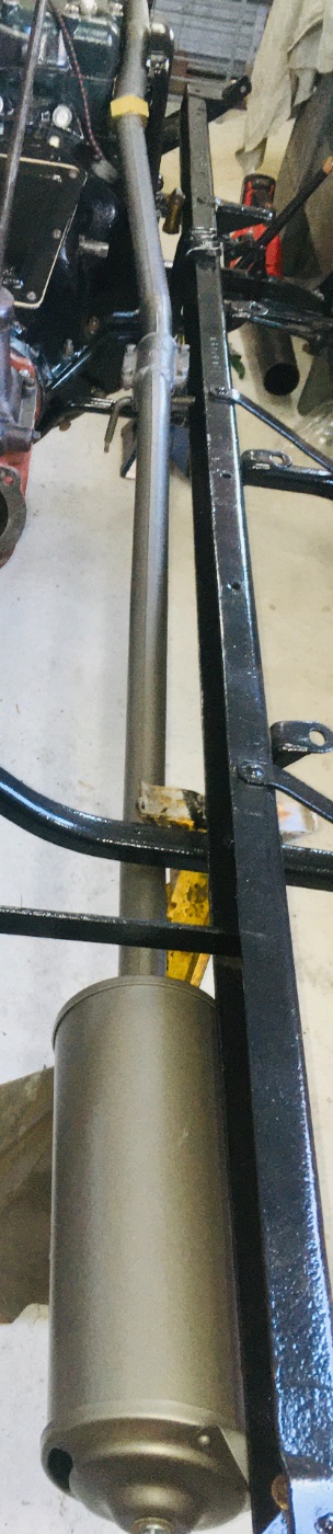 Installed the repaired and refurbished original exhaust pipe with Cooper cut out and modified to fit repo muffler.Installed the Chicago 3 speed aux transmission. New bearings and races, made the gaskets, had to replace the main shaft and one gear. Set up bearing preload based on own Theory as I couldn’t find any information on specs. Shifts smoothly, spins nice, fingers crossed.