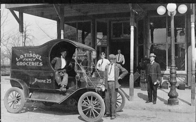 That is a lot of 1912 T Ford delivery trucks with decals just behind the doorway!
