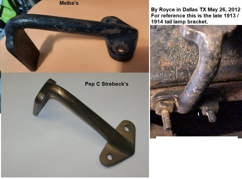 I believe this to be a 1914 tail lamp bracket (reproduction, cast bronze, not brass) and if anyone could offer confirmation or correction, any help would be appreciated.