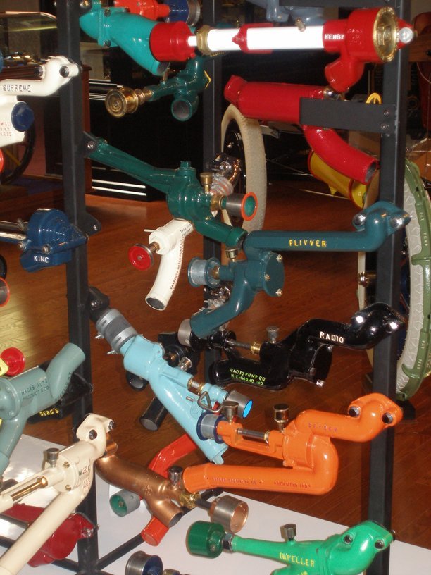 While I don't run a pump usually, it is fair to say that some of them work a lot better than others and that they DO circulate the water. Some of them don't look to me like they would have ever moved much water but some of them move a lot of water, even at idle or just above. I have a bunch of them, have always been going to put together a display. Now I have a bead blaster again I hope to get some of them cleaned up and mounted on a board or something. The trick on the packing is to use the correct packing, water pump packing. If the shaft is smooth and the packing good, they won't leak and will still turn. Just because it is dark and cold out this morning I'm going to post these pictures of some of the pump collection at the Speedy Bill Museum in Lincoln, Nebraska. This isn't all of them. Maybe it will inspire me to go out and turn the heat on in the shop and do something today.