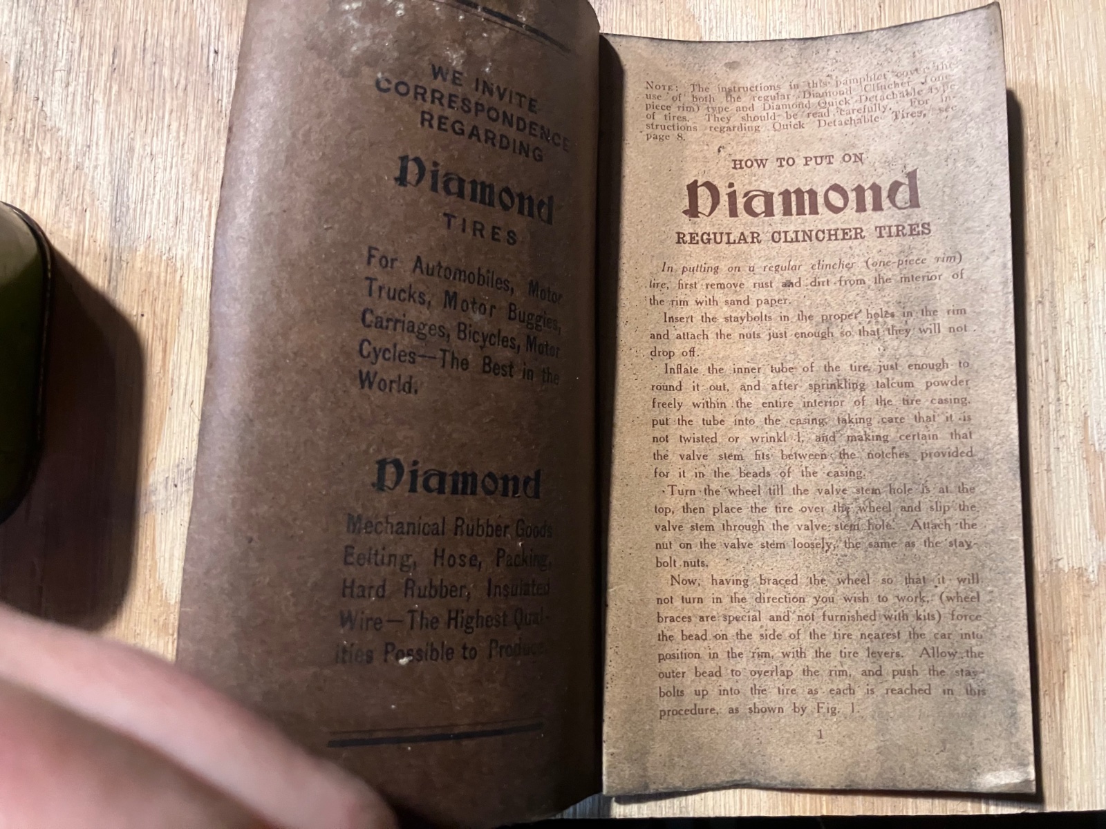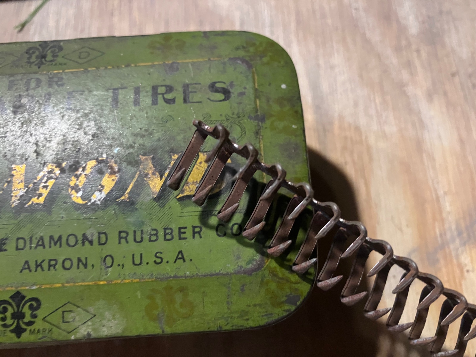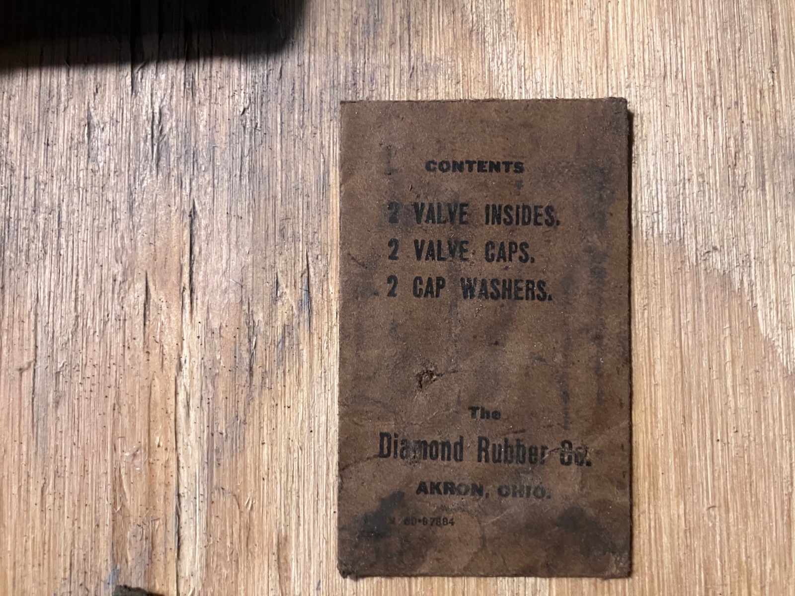 I picked up this from what looks like a complete Diamond tire repair kit. There is still talc in the tube. It’s missing the two Diamond Tire irons. On the small envelope it says: