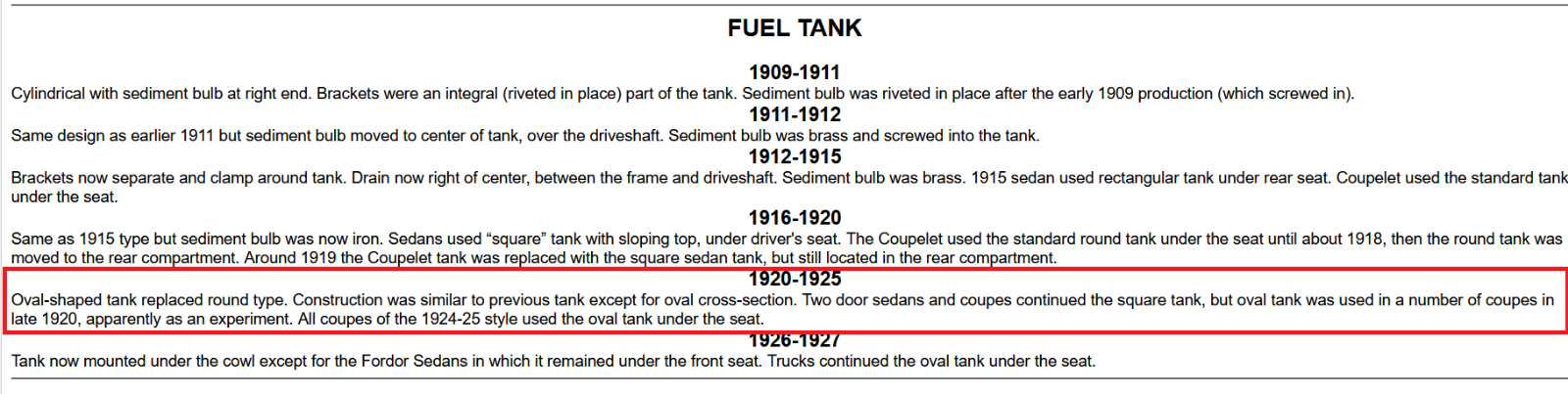 Oval-shaped tank replaced round type. Construction was similar to previous tank except for oval cross-section. Two door sedans and coupes continued the square tank, but oval tank was used in a number of coupes in late 1920, apparently as an experiment. All coupes of the 1924-25 style used the oval tank under the seat.